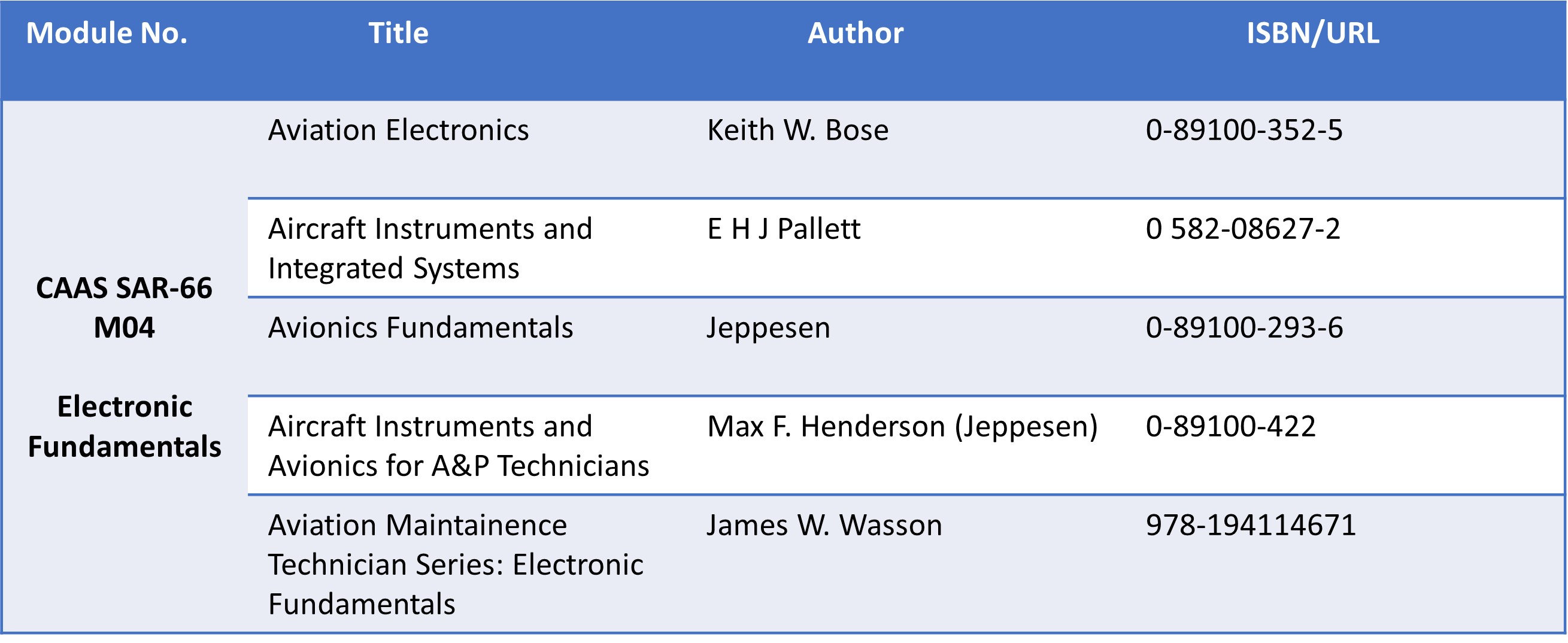 CAAS SAR-66 M04 Electronic FundamentalsThe publications listed in the table that follows are the recommended study references for persons preparing to sit for SAR-66 aircraft maintenance licence examinations. The candidate is however not expected to confine his or her studies to these books as generic information is widely available from a multitude of sources. The candidate must therefore also expect that the SAR-66 examination questions might contain variations from those materials covered in the recommended study references, but as far as possible, care would be taken to ensure that the examination syllabi are closely followed.List of suggested study references for SAR-66 basic knowledge examinations (AC 66 – 6 (Rev 1)) issued on 24 February 2021:-